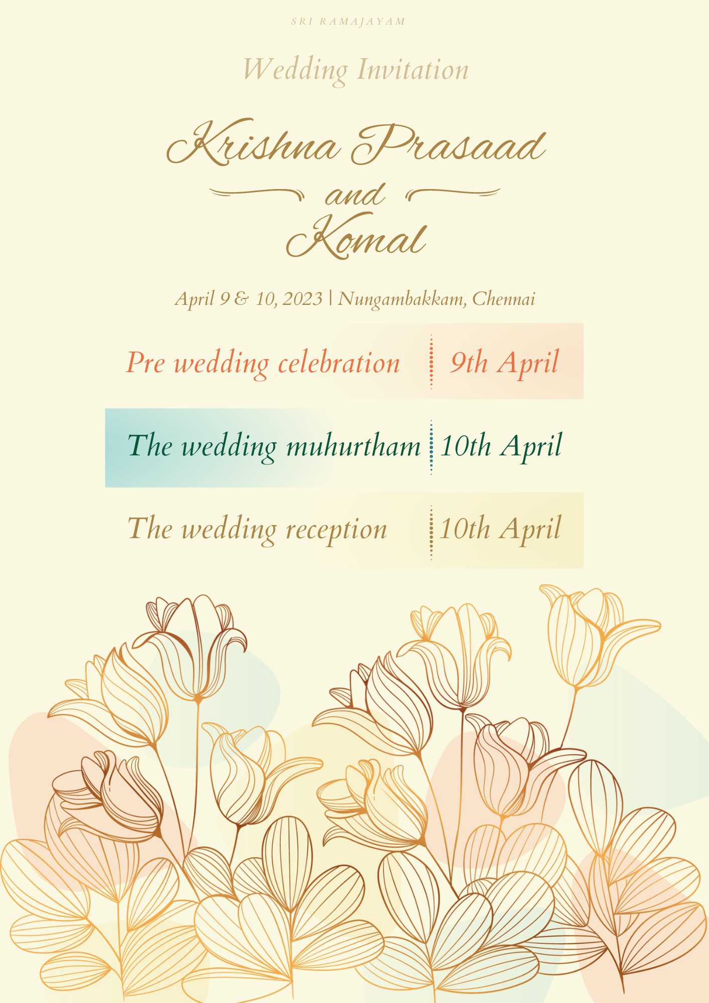 KP & Komal's Wedding Registry is an online registry for Krishna Prasaad and Komal's wedding happening on April 10th, 2023.